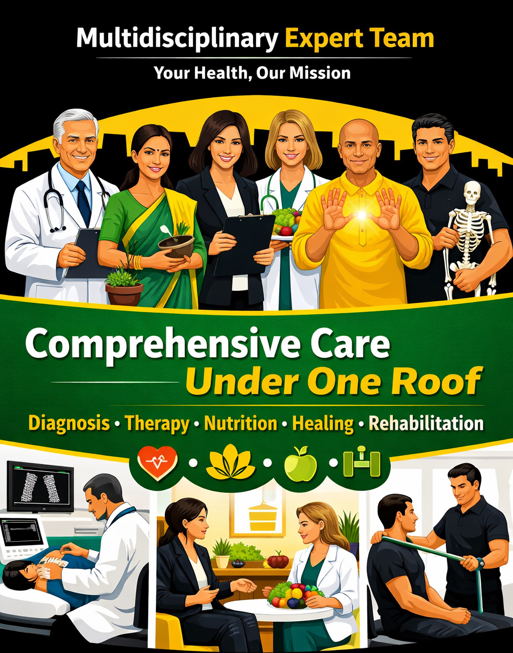 Senior General Physician, Integrative Physicians, Psychologists, Nutritionists, Pranic Healers, and Physiotherapists working together in coordination.