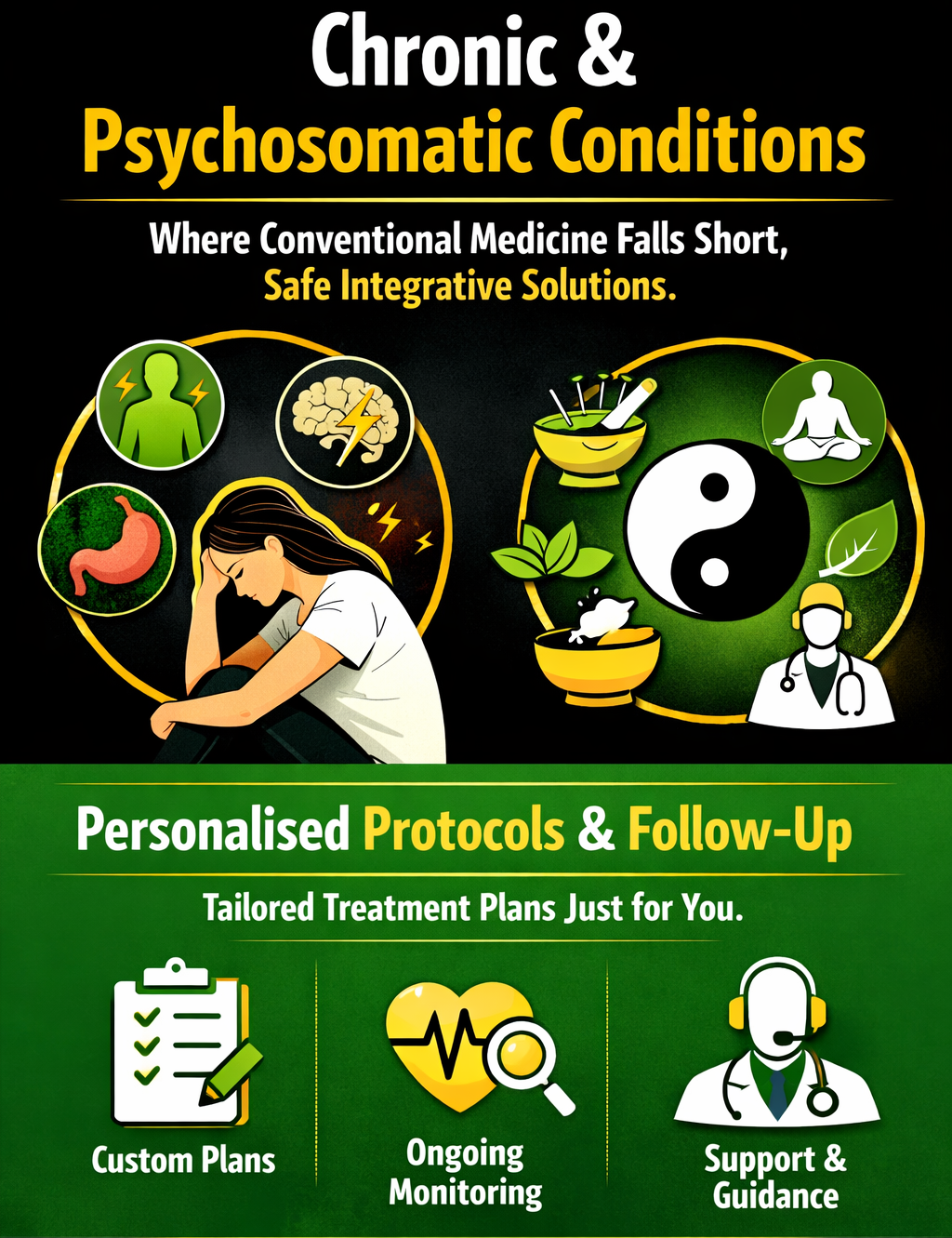 Special emphasis on conditions where conventional medicine alone may have limitations, with safe integrative solutions.